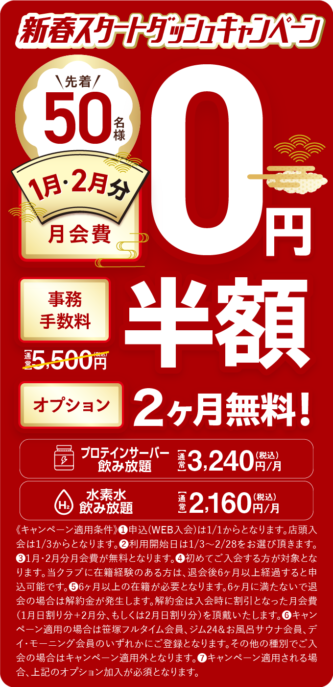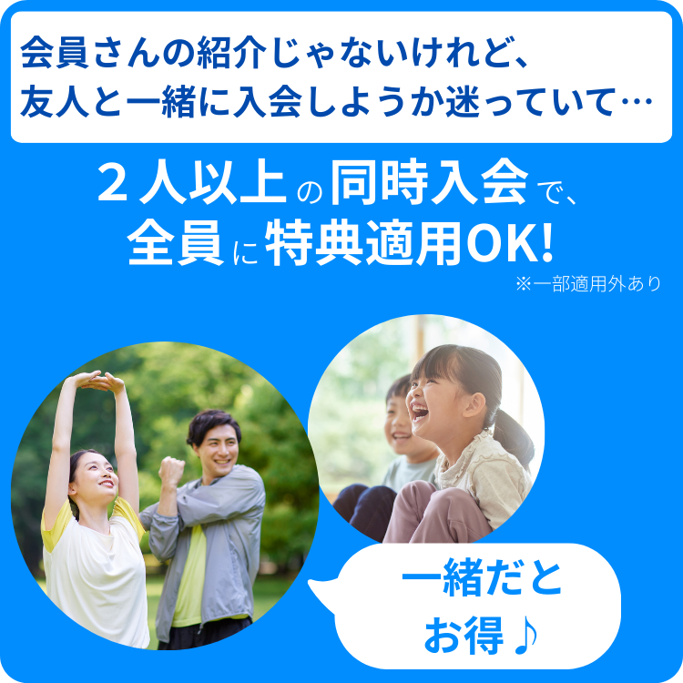 ●新規入会キャンペーンとの併用が可能です。その他特典との併用につきましては店舗にお問い合わせください。