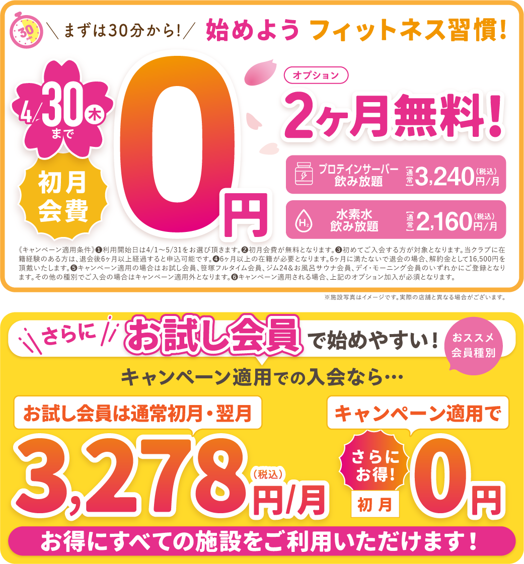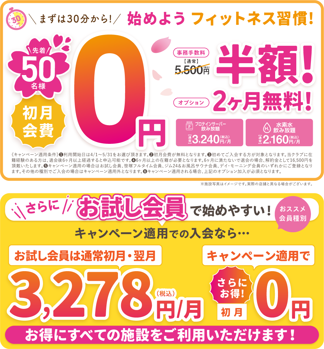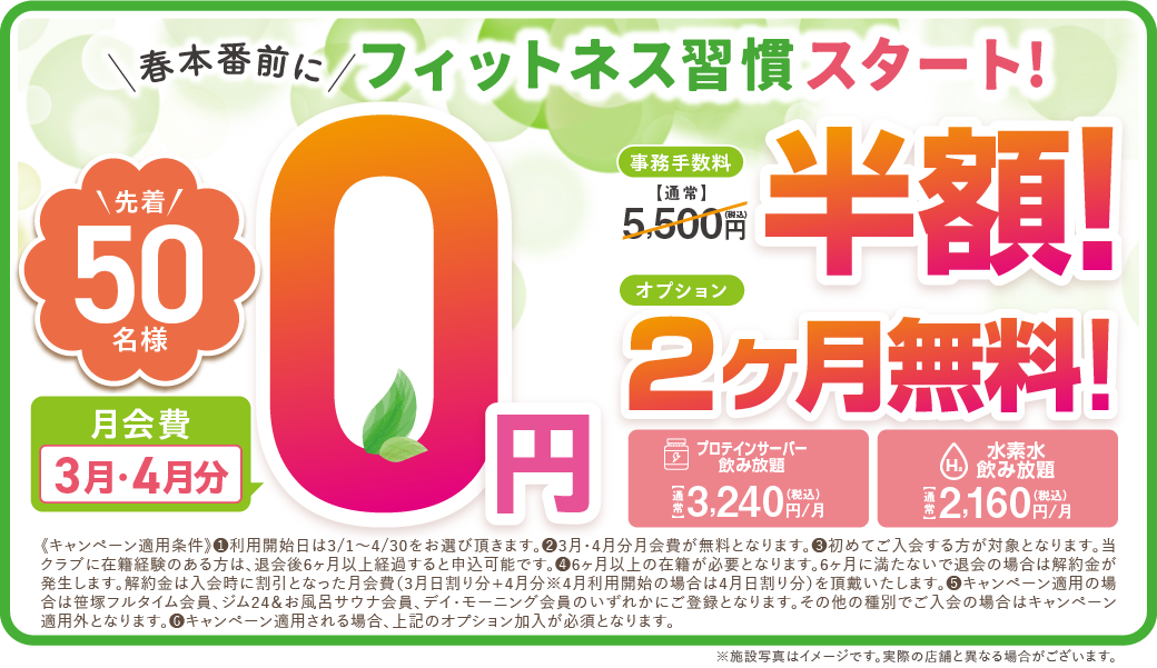 ① 初めてご入会する方が対象となります。当クラブに在籍経験のある方は、退会後6ヶ月以上経過すると申込可能です。(既存会員からの変更は出来ません) ② 初月会費は日割り計算となります。 ③ 6ヶ月以上の在籍が必要となります。6ヶ月に満たないで退会の場合は解約金が発生します。解約金は11,000円となります。 ④ お試し会員期間が終了すると3ヶ月目より自動で「笹塚フルタイム会員」への登録となります。それ以外の会員種別をご希望の場合は、2ヶ月目の25日までに変更手続きをお願いします。尚、スカッシュ会員への変更は出来ません。 ⑤ 別途、事務手数料5,500円のお支払いが必要となります。 ⑥ 次のオプションへの加入が必要となります。「プロテインサーバー飲み放題2ヶ月無料」「水素水飲み放題2ヶ月無料」 ※ 価格はすべて税込表記です。 ※ キャンペーン内容により金額・条件が変わる場合がございます。