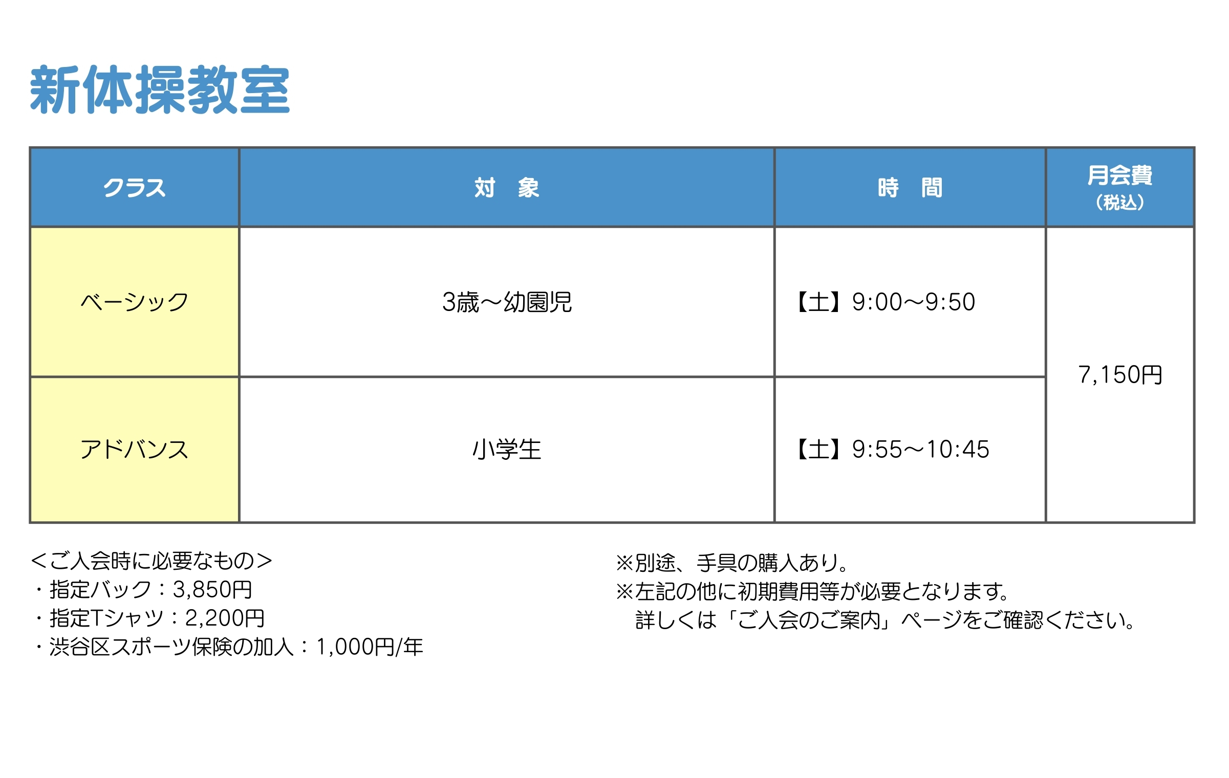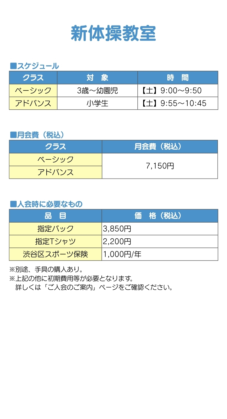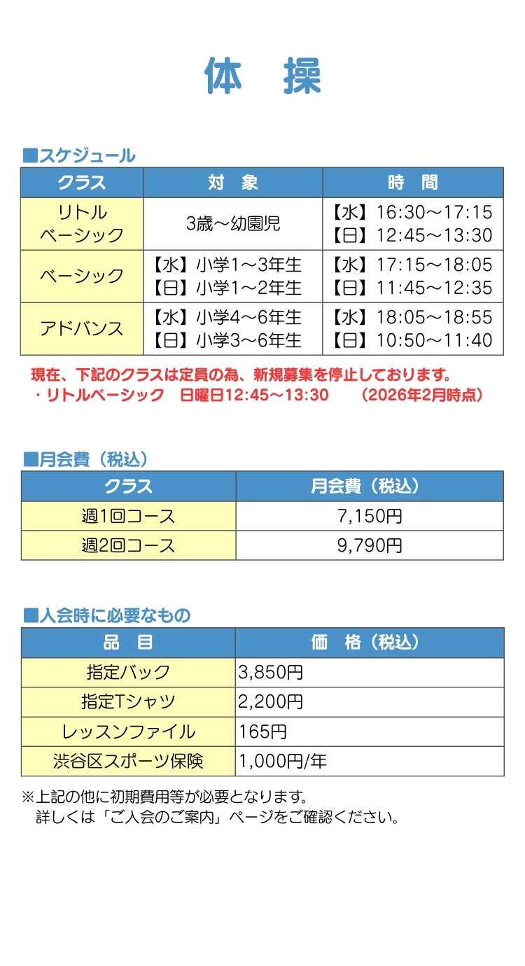 マット運動、鉄棒、跳び箱をメインにレッスンを行っていきます。各レッスンの基礎から丁寧に指導します。また、学校体育で必要な、運動能力を高めるレッスン内容となております。体操に必要なリズム感は、ウォーミングアップで自然に身につけていきます。縄跳び、ボール、フラフープなども取り入れながら様々な運動を行っていきます。